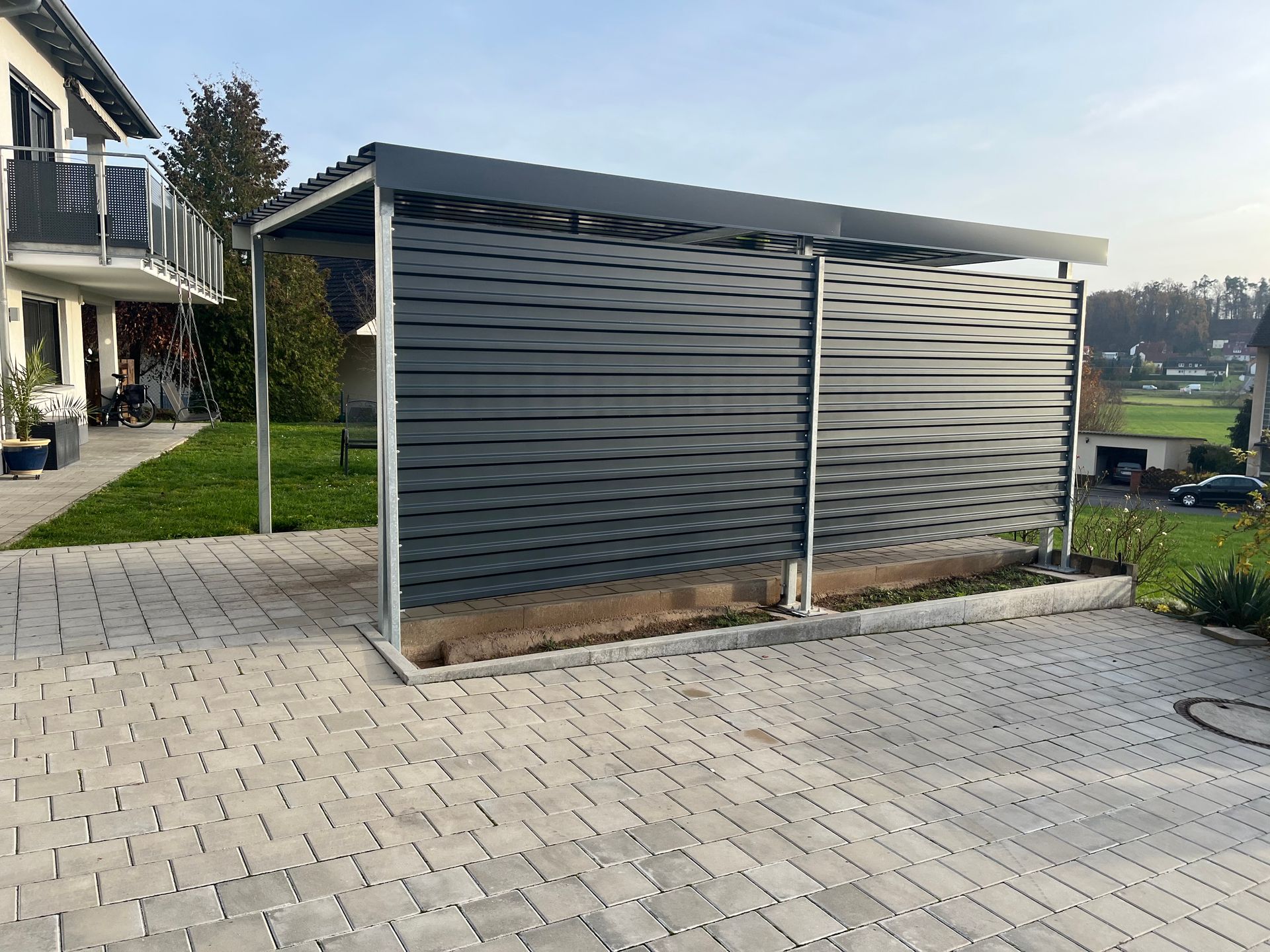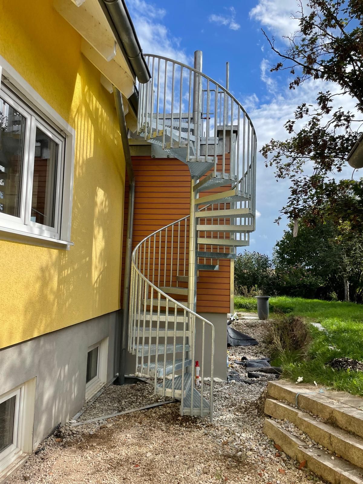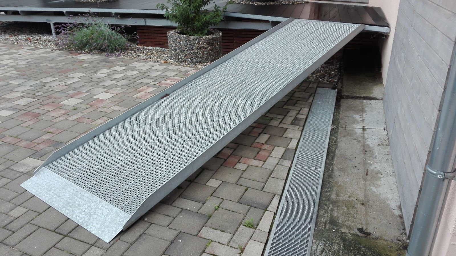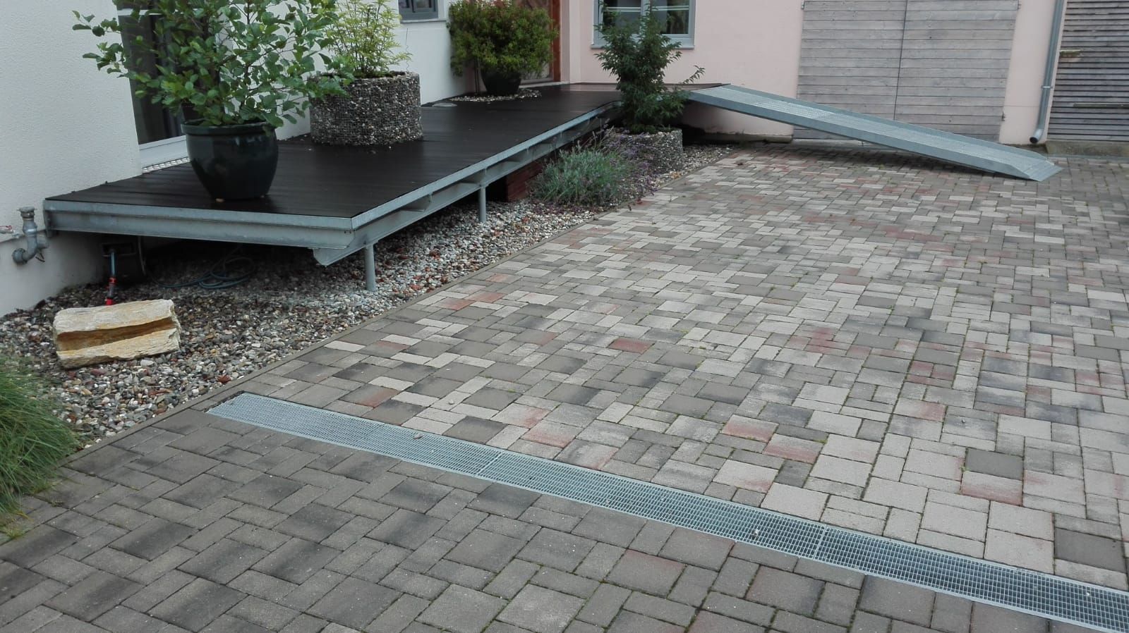 Außenbereich - Podest, gefertigte Stahlkonstruktion, davor Abflussrinne